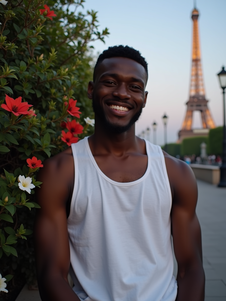 front view of model wearing white tank top the model is smiling and positioned in front of a lush green bush adorned with red and white flowers. in the background, there is a lit-up eiffel tower and a classic lamp post against a clear evening sky.