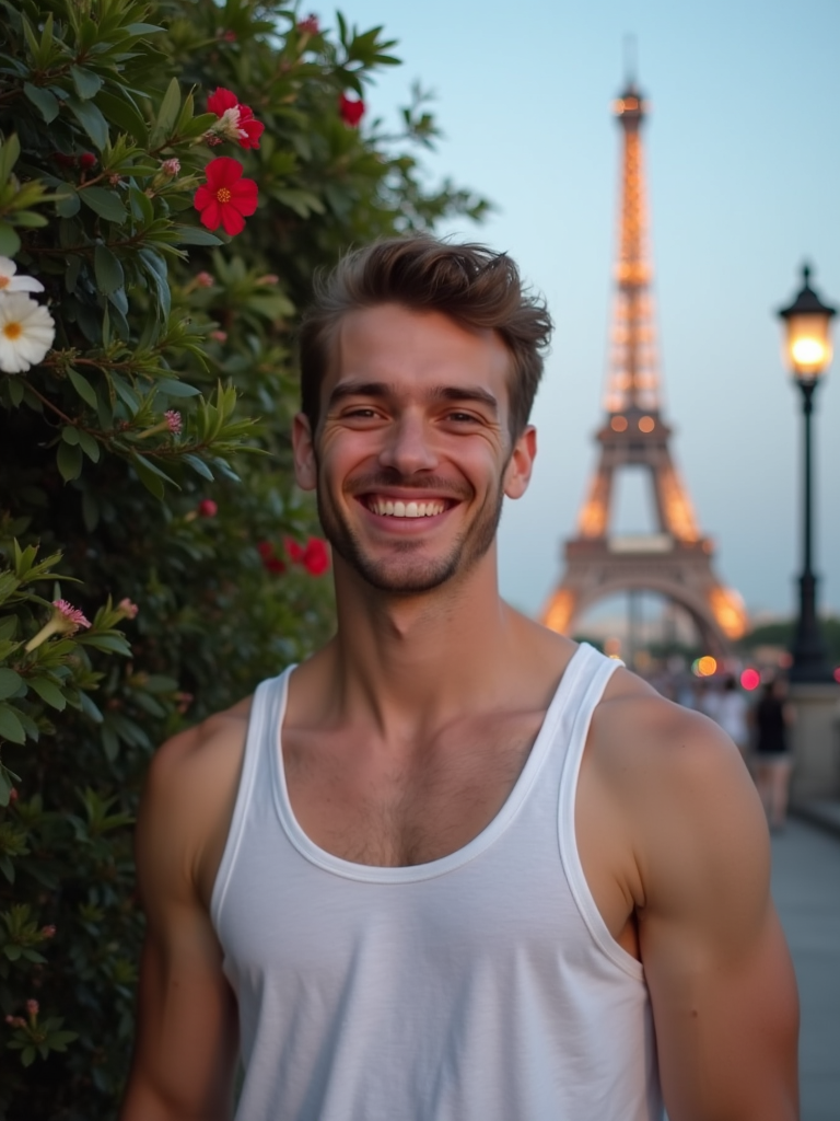 front view of model wearing white tank top the model is smiling and positioned in front of a lush green bush adorned with red and white flowers. in the background, there is a lit-up eiffel tower and a classic lamp post against a clear evening sky.