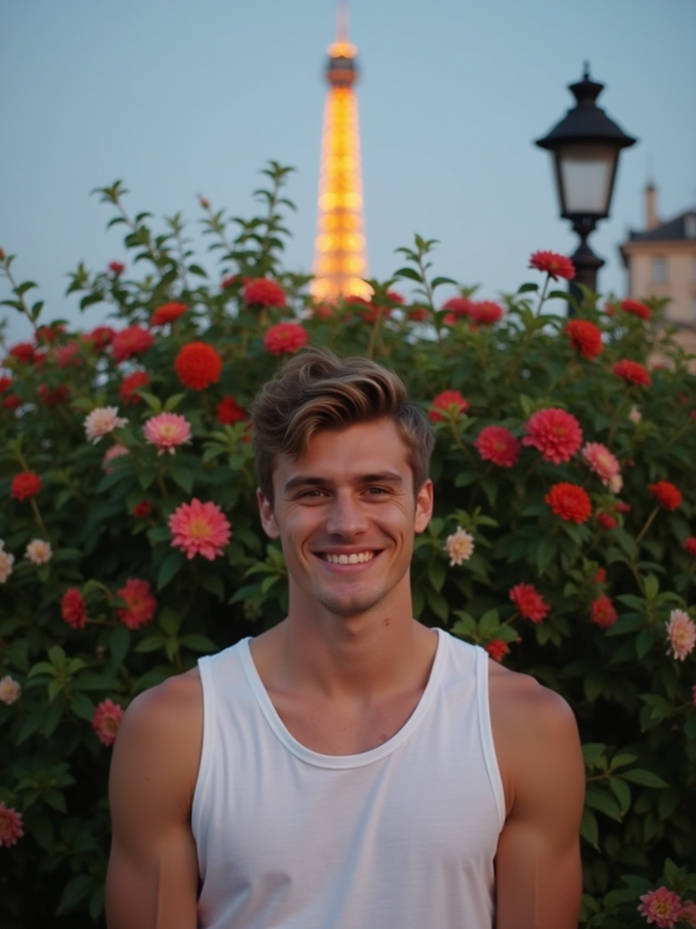 front view of model wearing white tank top the model is smiling and positioned in front of a lush green bush adorned with red and white flowers. in the background, there is a lit-up eiffel tower and a classic lamp post against a clear evening sky.