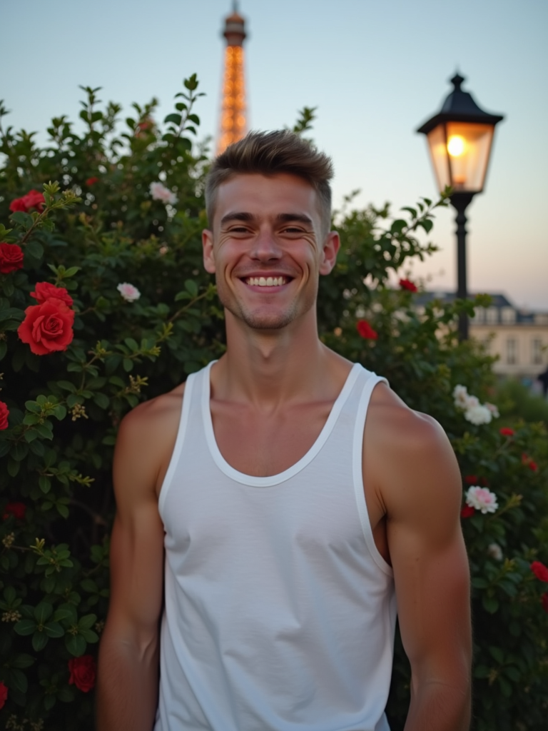 front view of model wearing white tank top the model is smiling and positioned in front of a lush green bush adorned with red and white flowers. in the background, there is a lit-up eiffel tower and a classic lamp post against a clear evening sky.