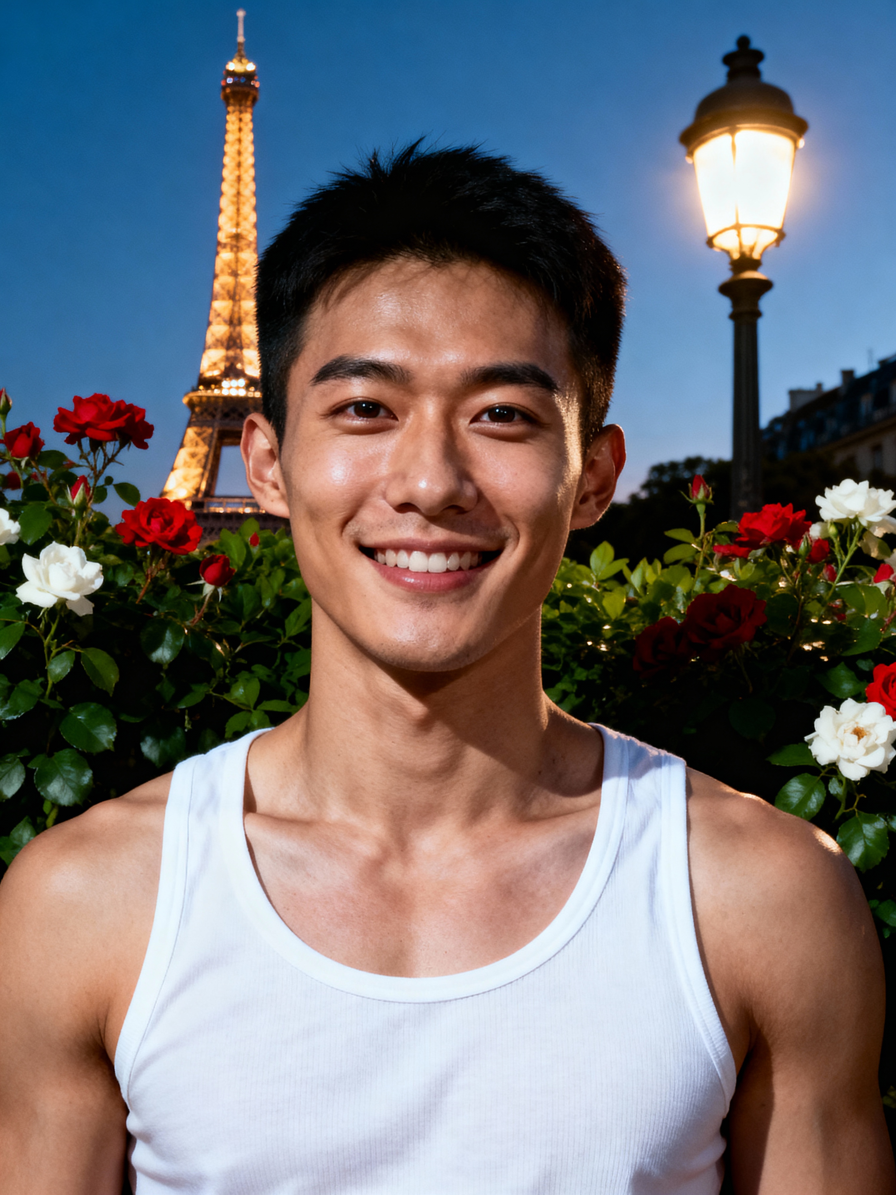 front view of model wearing white tank top the model is smiling and positioned in front of a lush green bush adorned with red and white flowers. in the background, there is a lit-up eiffel tower and a classic lamp post against a clear evening sky.