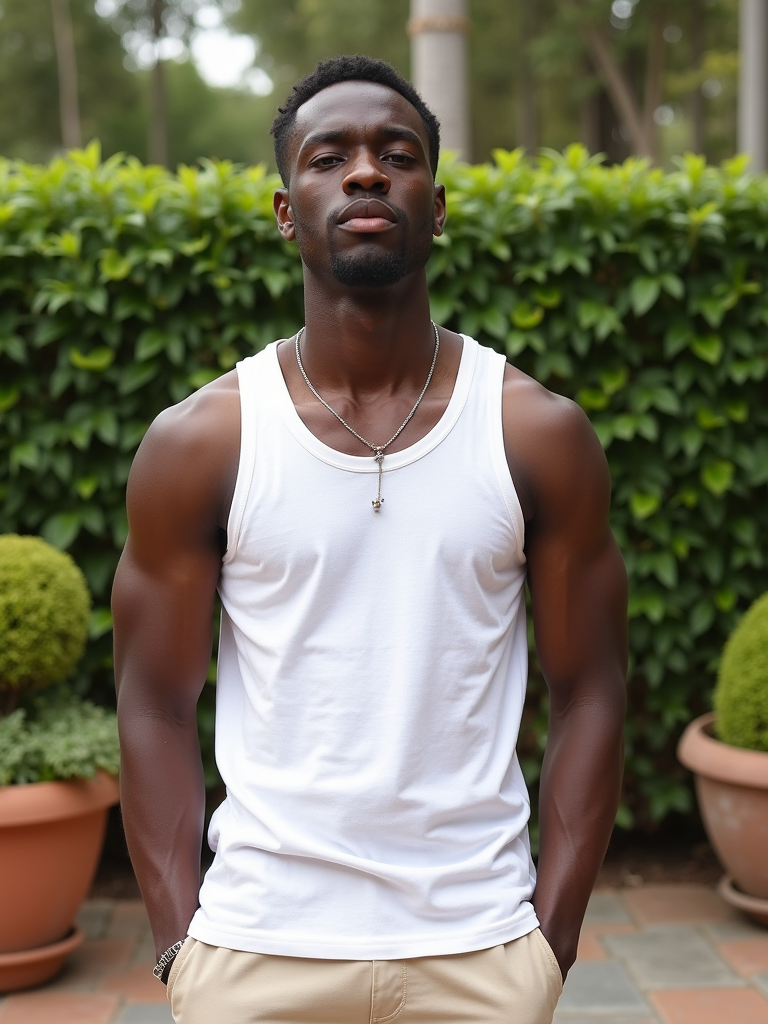 Front view of model wearing white tanktop. The model is standing in an outdoor garden setting with lush greenery and potted plants in the background. The model's face is slightly tilted with a direct gaze towards the camera. The outfit is complemented by beige pants, and a necklace is visible around the model's neck. The background shows a mix of trimmed hedges and trees, creating a serene and natural atmosphere.