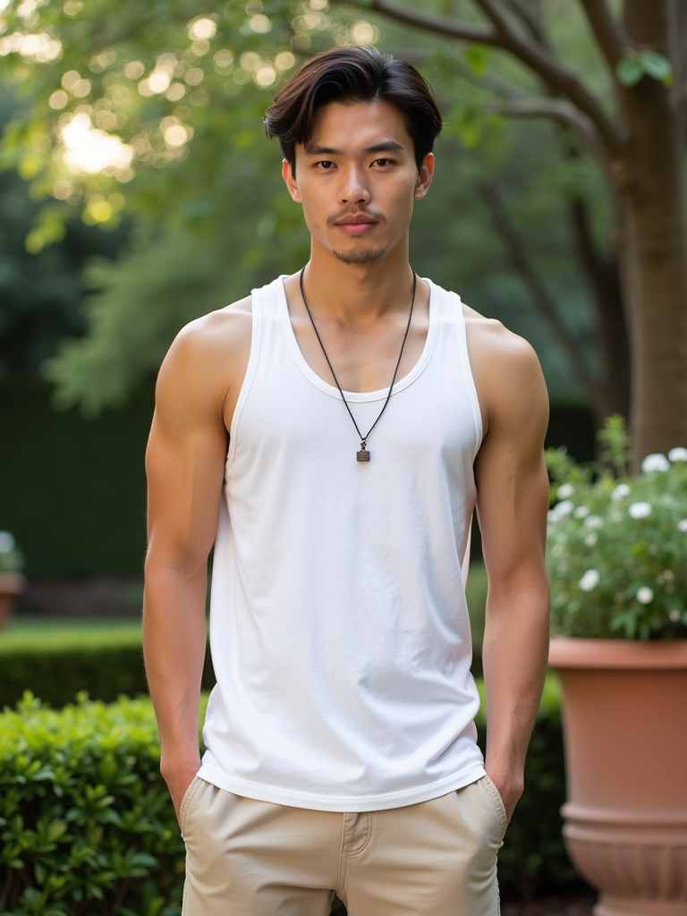 Front view of model wearing white tanktop. The model is standing in an outdoor garden setting with lush greenery and potted plants in the background. The model's face is slightly tilted with a direct gaze towards the camera. The outfit is complemented by beige pants, and a necklace is visible around the model's neck. The background shows a mix of trimmed hedges and trees, creating a serene and natural atmosphere.