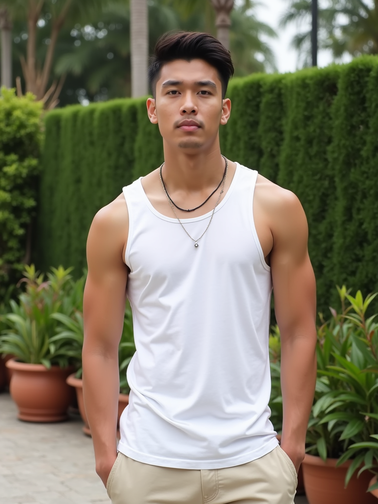 Front view of model wearing white tanktop. The model is standing in an outdoor garden setting with lush greenery and potted plants in the background. The model's face is slightly tilted with a direct gaze towards the camera. The outfit is complemented by beige pants, and a necklace is visible around the model's neck. The background shows a mix of trimmed hedges and trees, creating a serene and natural atmosphere.