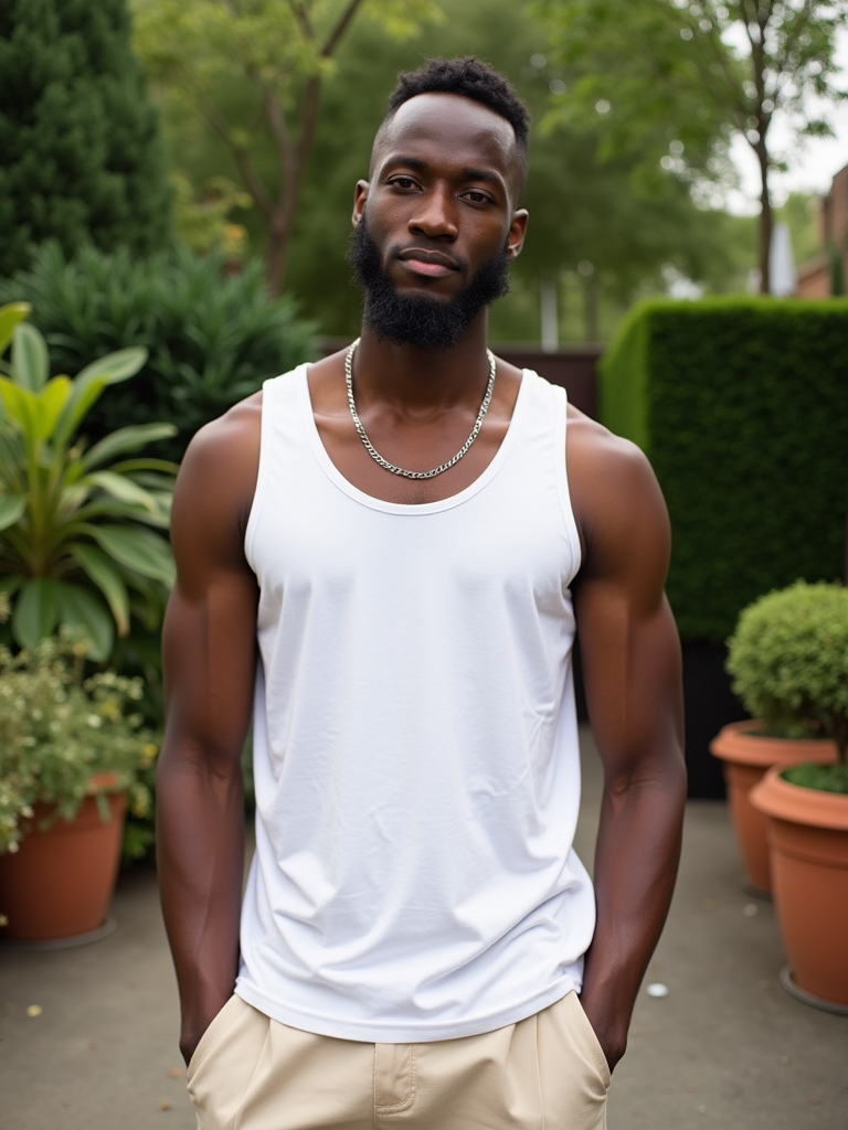 Front view of model wearing white tanktop. The model is standing in an outdoor garden setting with lush greenery and potted plants in the background. The model's face is slightly tilted with a direct gaze towards the camera. The outfit is complemented by beige pants, and a necklace is visible around the model's neck. The background shows a mix of trimmed hedges and trees, creating a serene and natural atmosphere.