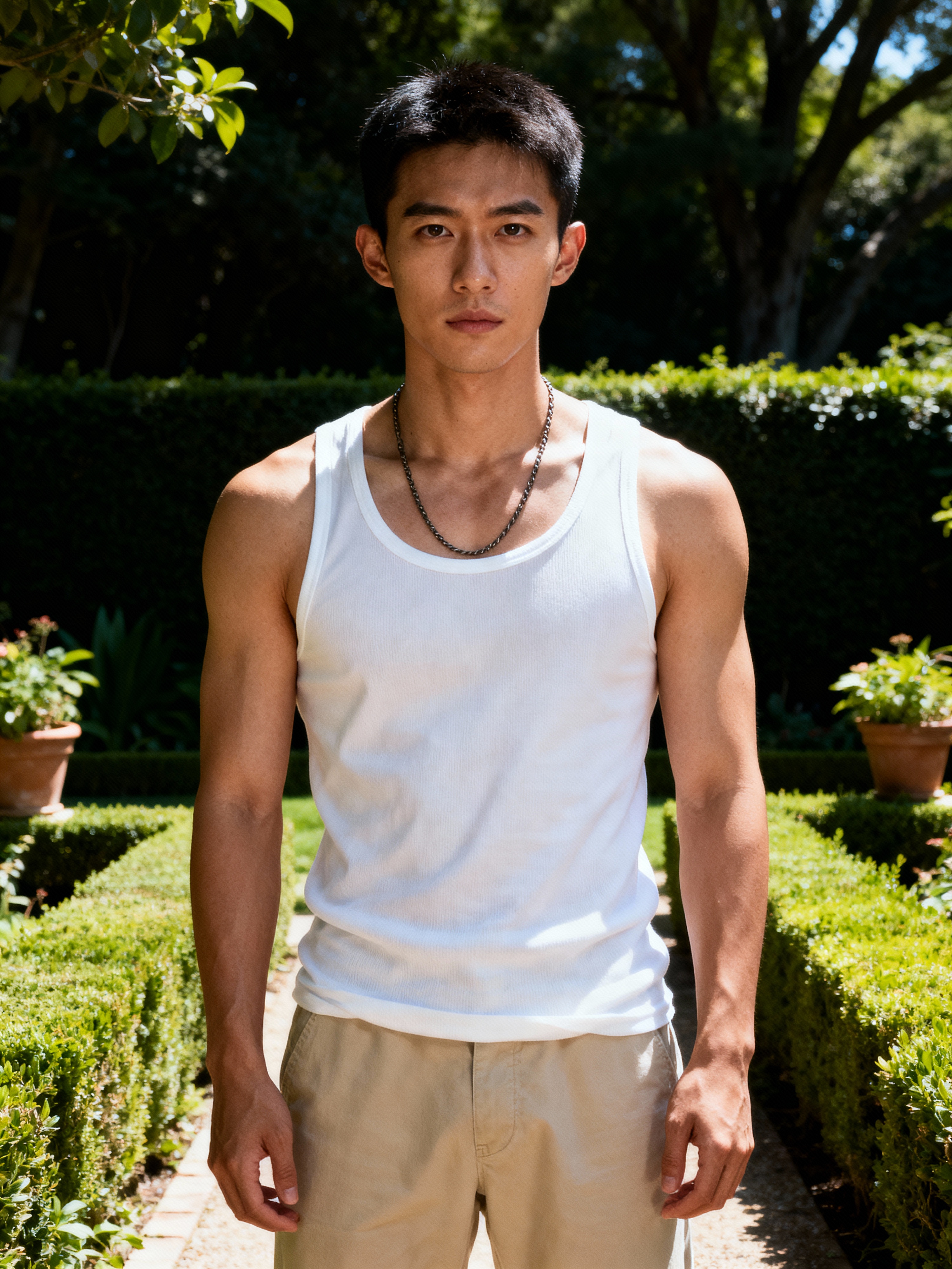Front view of model wearing white tanktop. The model is standing in an outdoor garden setting with lush greenery and potted plants in the background. The model's face is slightly tilted with a direct gaze towards the camera. The outfit is complemented by beige pants, and a necklace is visible around the model's neck. The background shows a mix of trimmed hedges and trees, creating a serene and natural atmosphere.