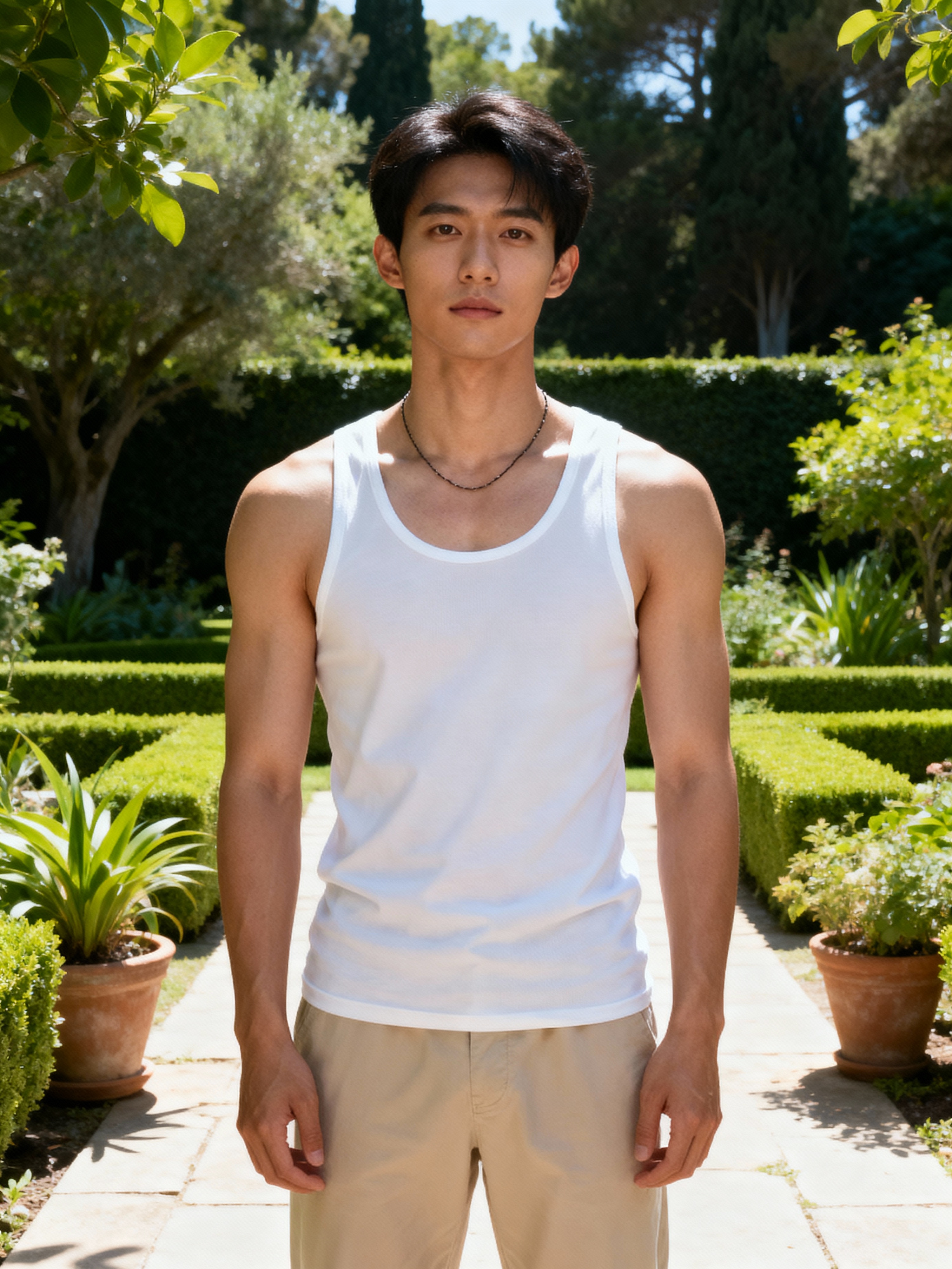 Front view of model wearing white tanktop. The model is standing in an outdoor garden setting with lush greenery and potted plants in the background. The model's face is slightly tilted with a direct gaze towards the camera. The outfit is complemented by beige pants, and a necklace is visible around the model's neck. The background shows a mix of trimmed hedges and trees, creating a serene and natural atmosphere.