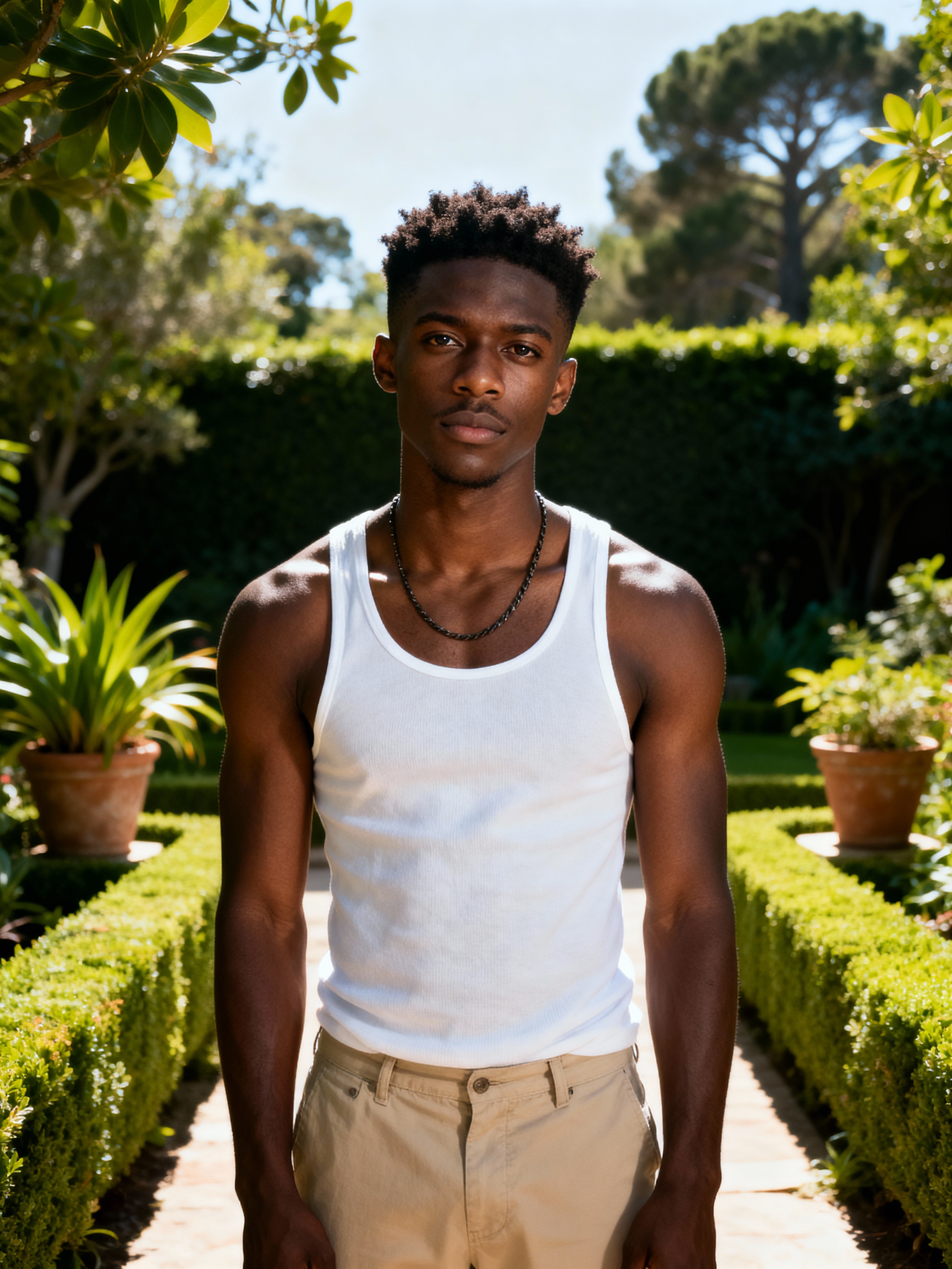 Front view of model wearing white tanktop. The model is standing in an outdoor garden setting with lush greenery and potted plants in the background. The model's face is slightly tilted with a direct gaze towards the camera. The outfit is complemented by beige pants, and a necklace is visible around the model's neck. The background shows a mix of trimmed hedges and trees, creating a serene and natural atmosphere.