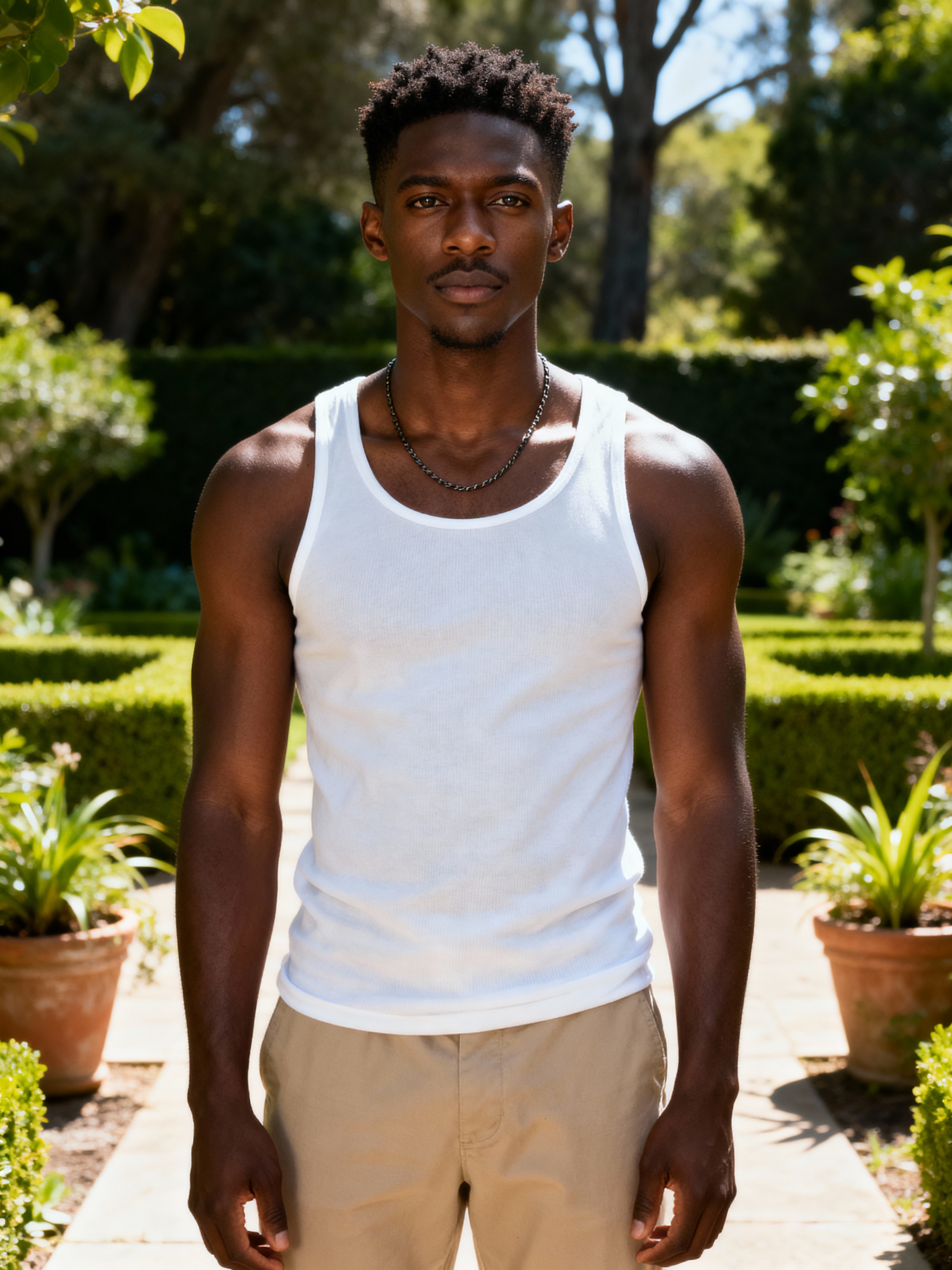 Front view of model wearing white tanktop. The model is standing in an outdoor garden setting with lush greenery and potted plants in the background. The model's face is slightly tilted with a direct gaze towards the camera. The outfit is complemented by beige pants, and a necklace is visible around the model's neck. The background shows a mix of trimmed hedges and trees, creating a serene and natural atmosphere.