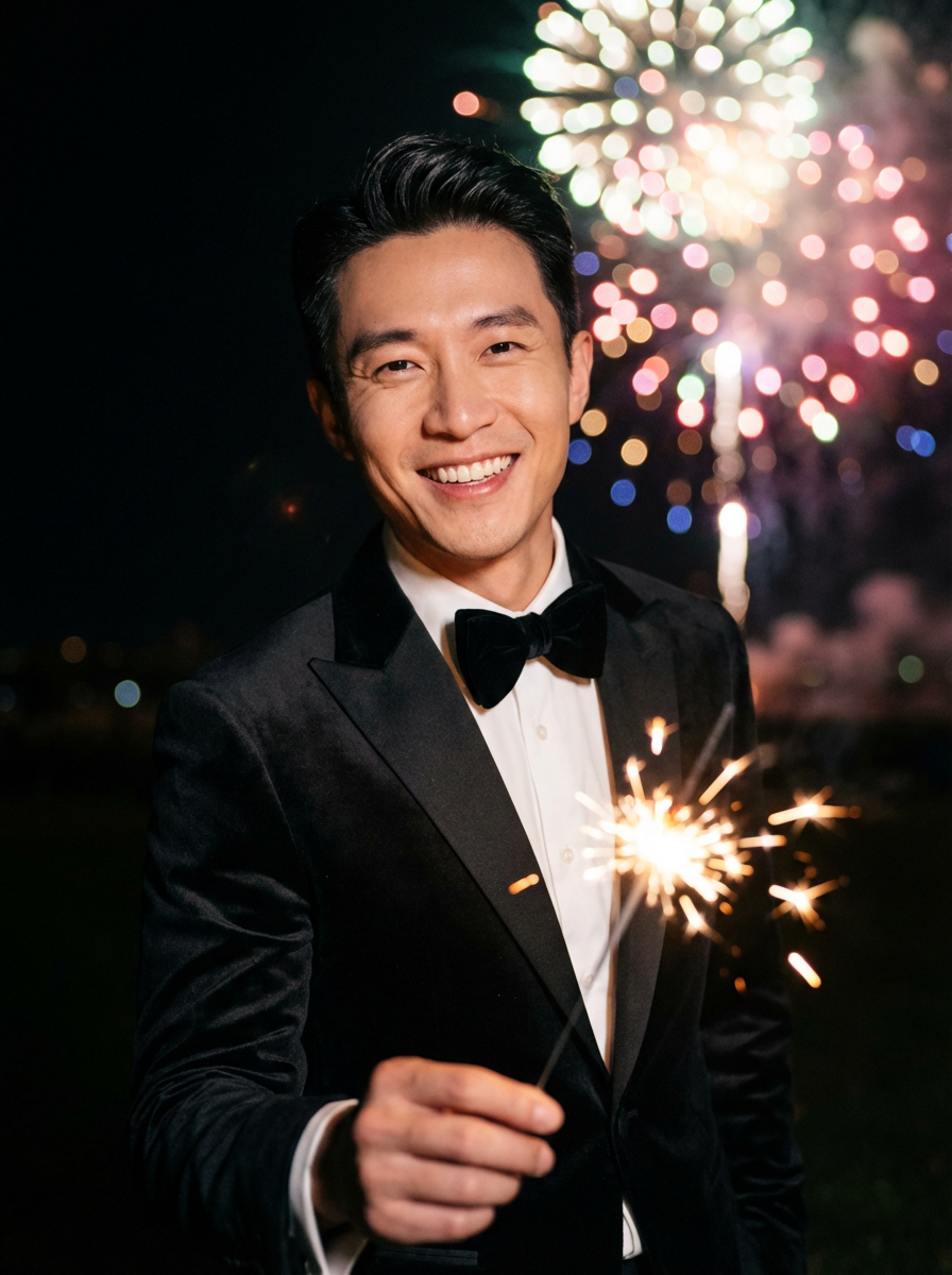 Front view of smiling model in a sleek black tuxedo with a velvet bow tie. The model is holding a sparkler in a festive environment with colorful fireworks in the background. Cinematic lighting.