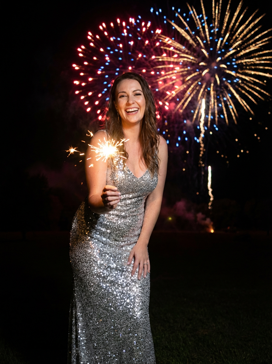 Front view of smiling model in a shimmering silver gown with intricate sequins . The model is holding a sparkler in a festive environment with colorful fireworks in the background. Cinematic lighting.