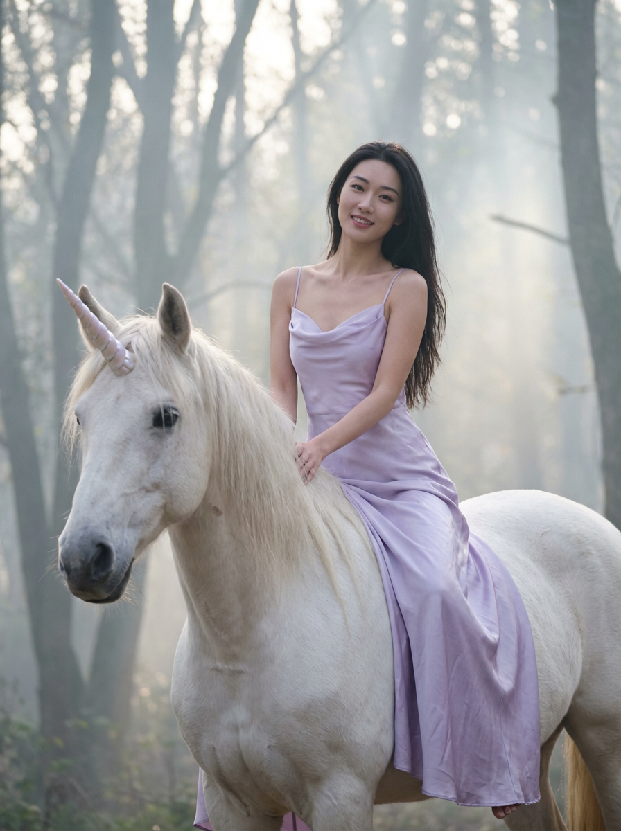 front view of model sitting on a white unicorn in a misty, fairytale-like setting. the model wears a silky, light lavender gown with thin straps , and long, loose hair cascades over the shoulders. the unicorn has a majestic horn and a flowing mane. in the background, blurred silhouettes of trees rise up in a foggy forest, adding to the ethereal atmosphere