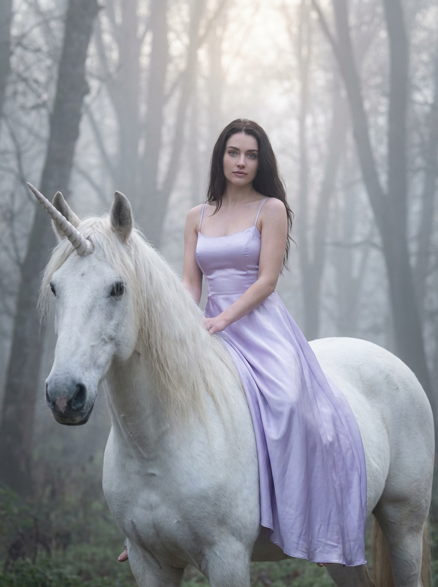 front view of model sitting on a white unicorn in a misty, fairytale-like setting. the model wears a silky, light lavender gown with thin straps , and long, loose hair cascades over the shoulders. the unicorn has a majestic horn and a flowing mane. in the background, blurred silhouettes of trees rise up in a foggy forest, adding to the ethereal atmosphere