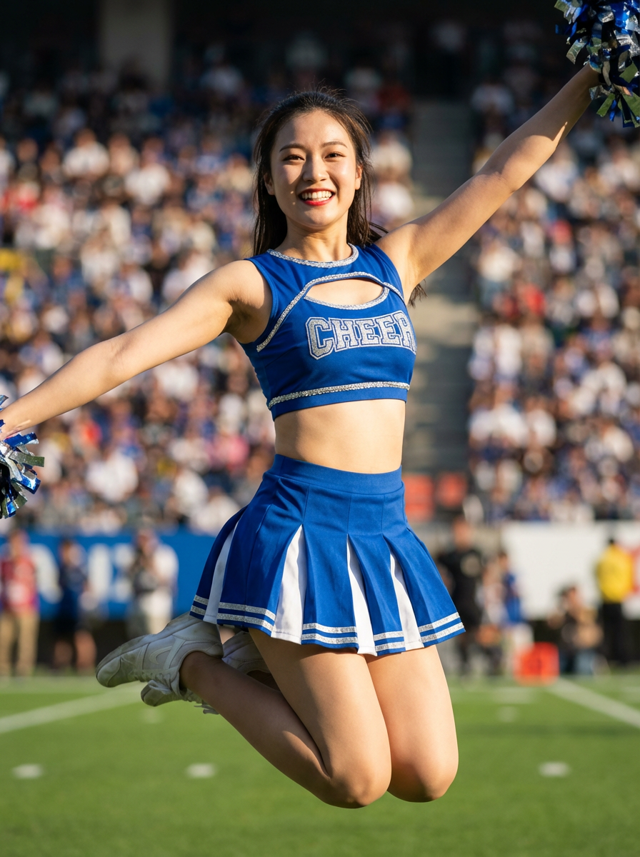 Front view of model smiling directly at camera. The model wears a blue cheerleading outfit featuring a crop top matching blue and white pleated skirt. The top has a cut-out design below the bust. dynamic and energetic pose, stadium background, vibrant lighting