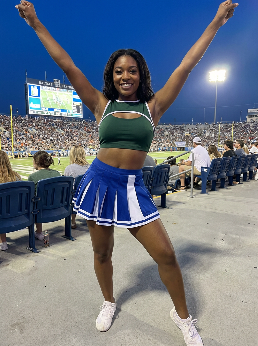 front view of model smiling directly at camera. the model wears a green cheerleading outfit featuring a crop top matching blue and white pleated skirt. the top has a cut-out design below the bust. dynamic and energetic pose, stadium background, vibrant lighting