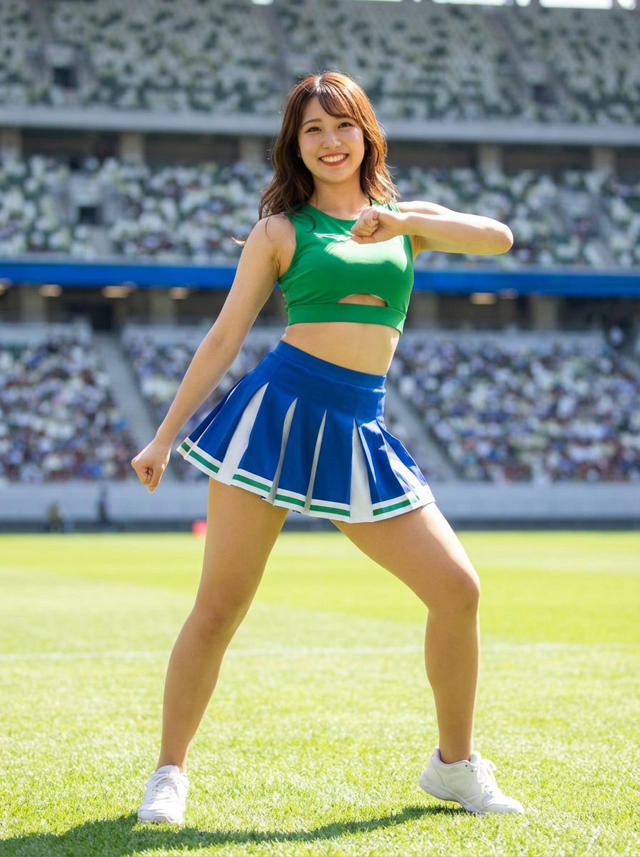 front view of model smiling directly at camera. the model wears a green cheerleading outfit featuring a crop top matching blue and white pleated skirt. the top has a cut-out design below the bust. dynamic and energetic pose, stadium background, vibrant lighting