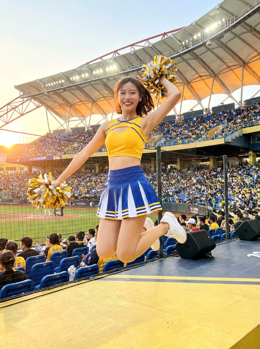 front view of model smiling directly at camera. the model wears a yellow cheerleading outfit featuring a crop top matching blue and white pleated skirt. the top has a cut-out design below the bust. dynamic and energetic pose, stadium background, vibrant lighting