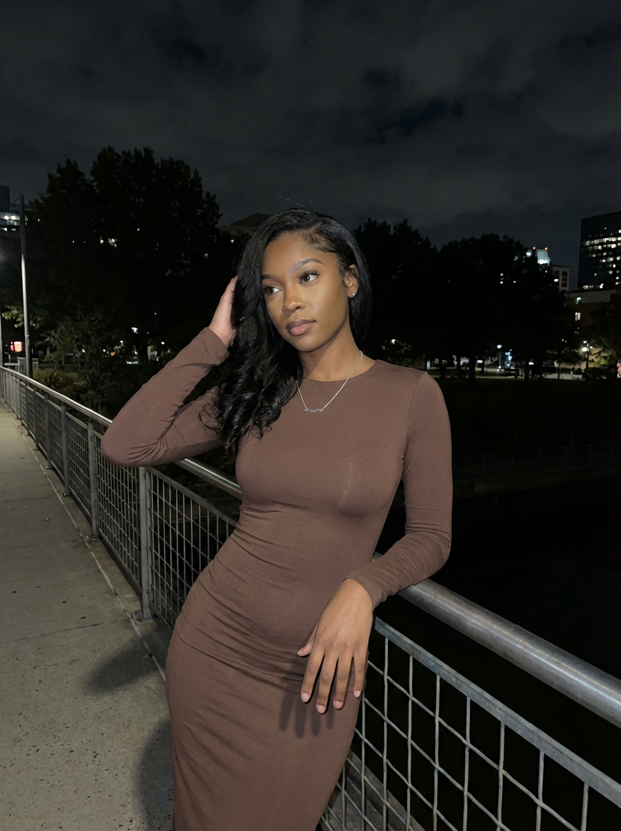 Front view of model standing outdoors at night, leaning on a railing. The model is wearing a long-sleeved, form-fitting brown dress . One hand rests on their head while the other is on the railing. Long, wavy hair flipped to the side falls over one shoulder. We can see three quarter of their face. A simple necklace adorns their neck. The background is dark, with faint outlines of trees and buildings visible under the night sky.