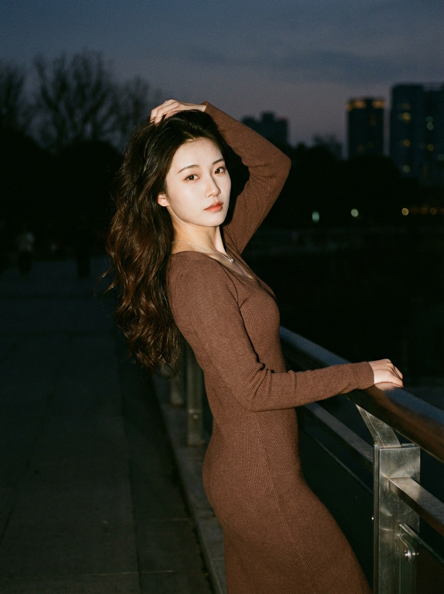 Front view of model standing outdoors at night, leaning on a railing. The model is wearing a long-sleeved, form-fitting brown dress . One hand rests on their head while the other is on the railing. Long, wavy hair flipped to the side falls over one shoulder. We can see three quarter of their face. A simple necklace adorns their neck. The background is dark, with faint outlines of trees and buildings visible under the night sky.