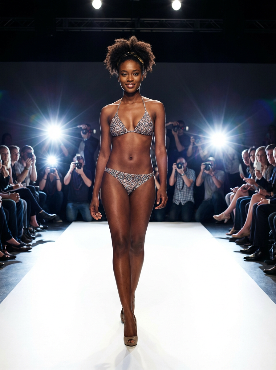 front view of model striding confidently down a fashion runway in bikini, surrounded by flashing camera lights.
