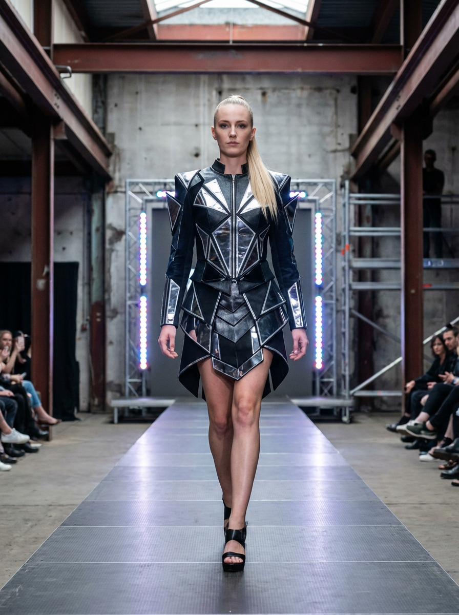 front view of model walking on a fashion runway in an industrial space, showcasing a futuristic outfit with sharp lines
