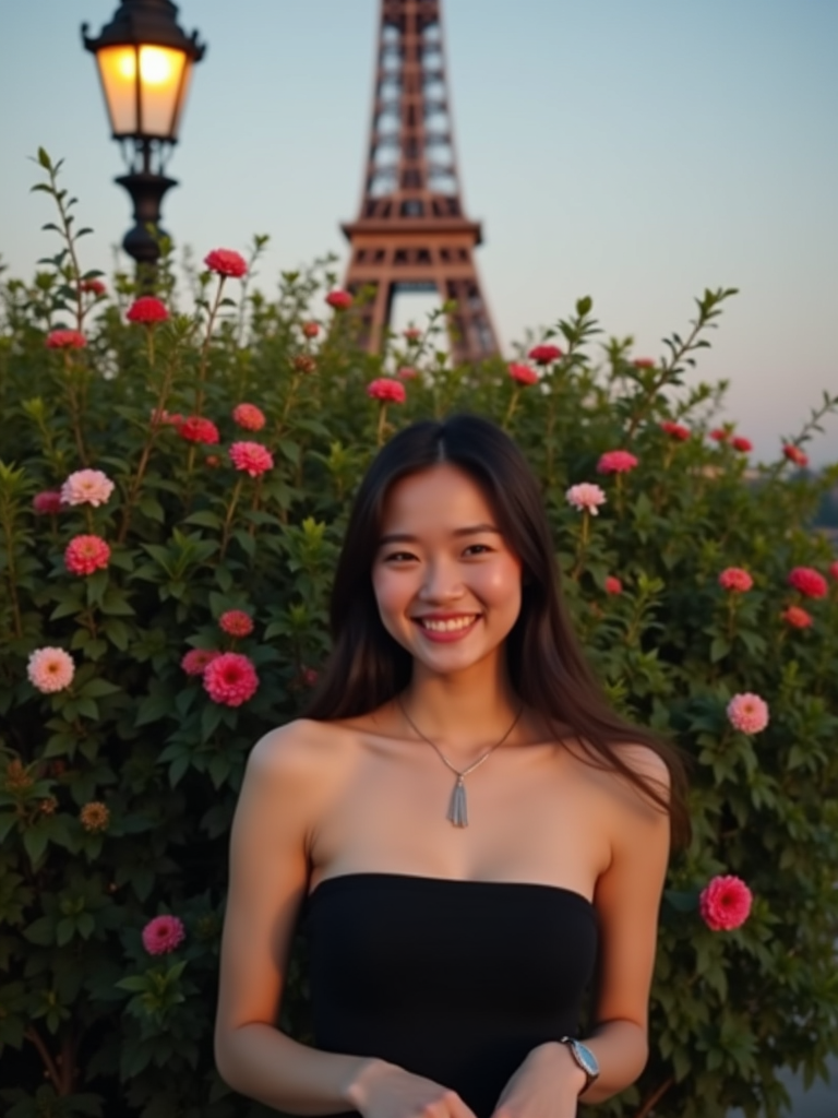 front view of model wearing a strapless black top and a delicate necklace. the model is smiling and positioned in front of a lush green bush adorned with red and white flowers. in the background, there is a lit-up eiffel tower and a classic lamp post against a clear evening sky.