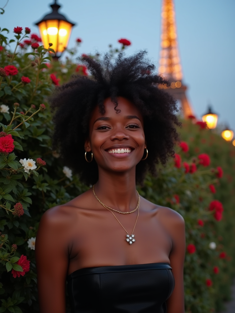 front view of model wearing a strapless black top and a delicate necklace. the model is smiling and positioned in front of a lush green bush adorned with red and white flowers. in the background, there is a lit-up eiffel tower and a classic lamp post against a clear evening sky.