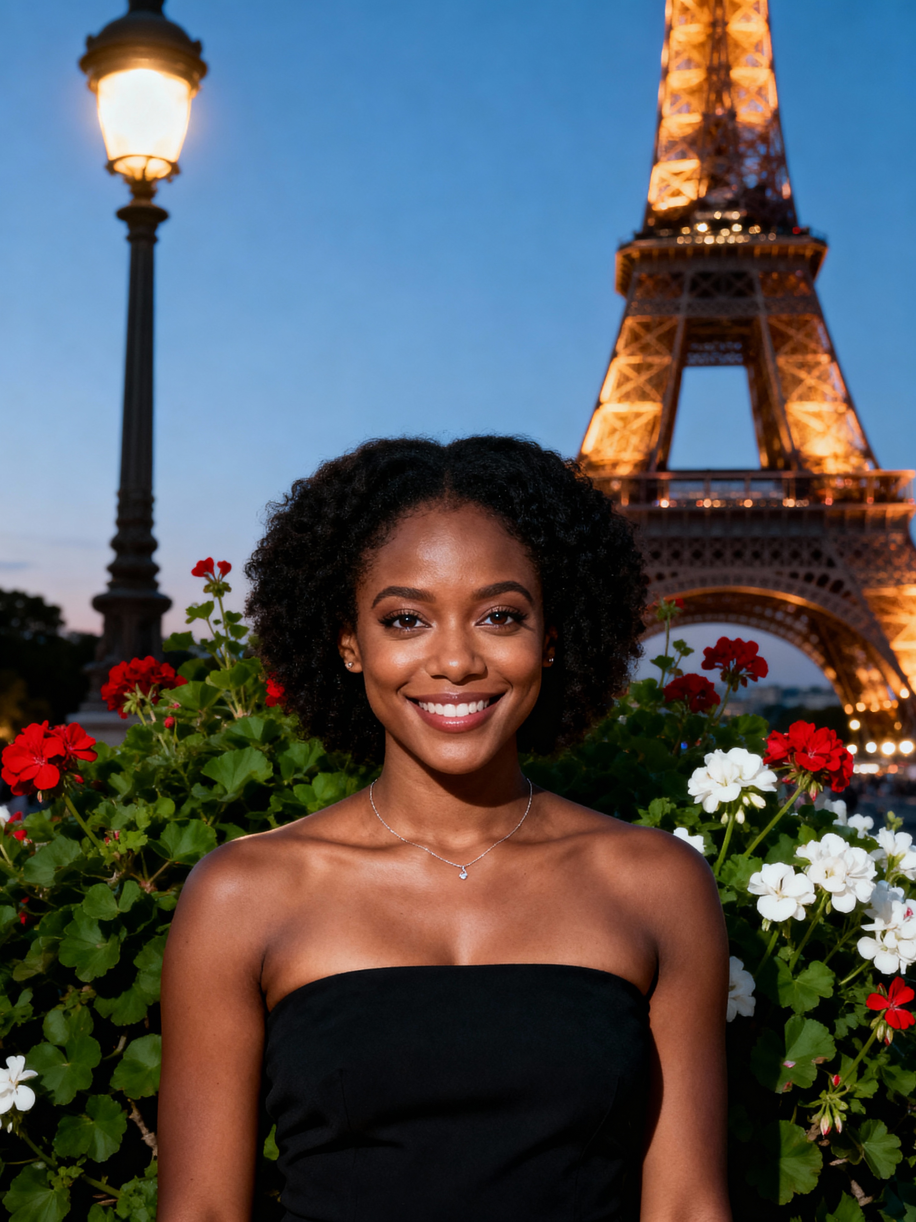 front view of model wearing a strapless black top and a delicate necklace. the model is smiling and positioned in front of a lush green bush adorned with red and white flowers. in the background, there is a lit-up eiffel tower and a classic lamp post against a clear evening sky.