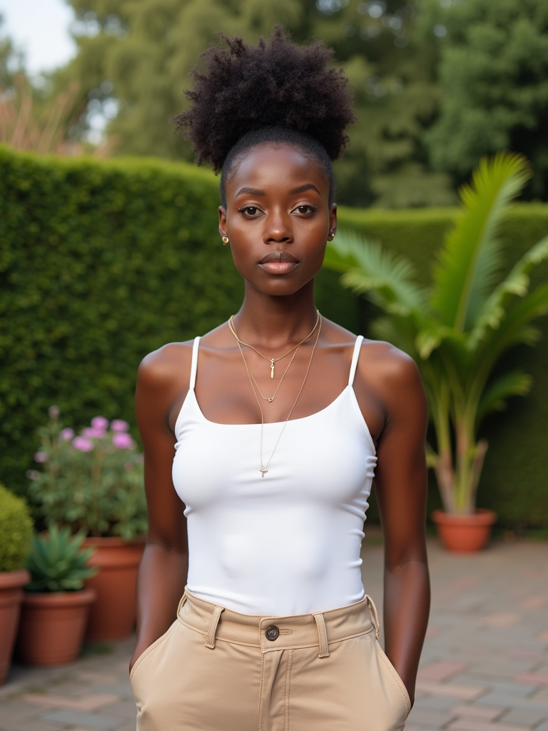 Front view of model wearing a white sleeveless spaghetti top . The model is standing in an outdoor garden setting with lush greenery and potted plants in the background. The model's face is slightly tilted with a direct gaze towards the camera. The outfit is complemented by beige pants, and a necklace is visible around the model's neck. The background shows a mix of trimmed hedges and trees, creating a serene and natural atmosphere.