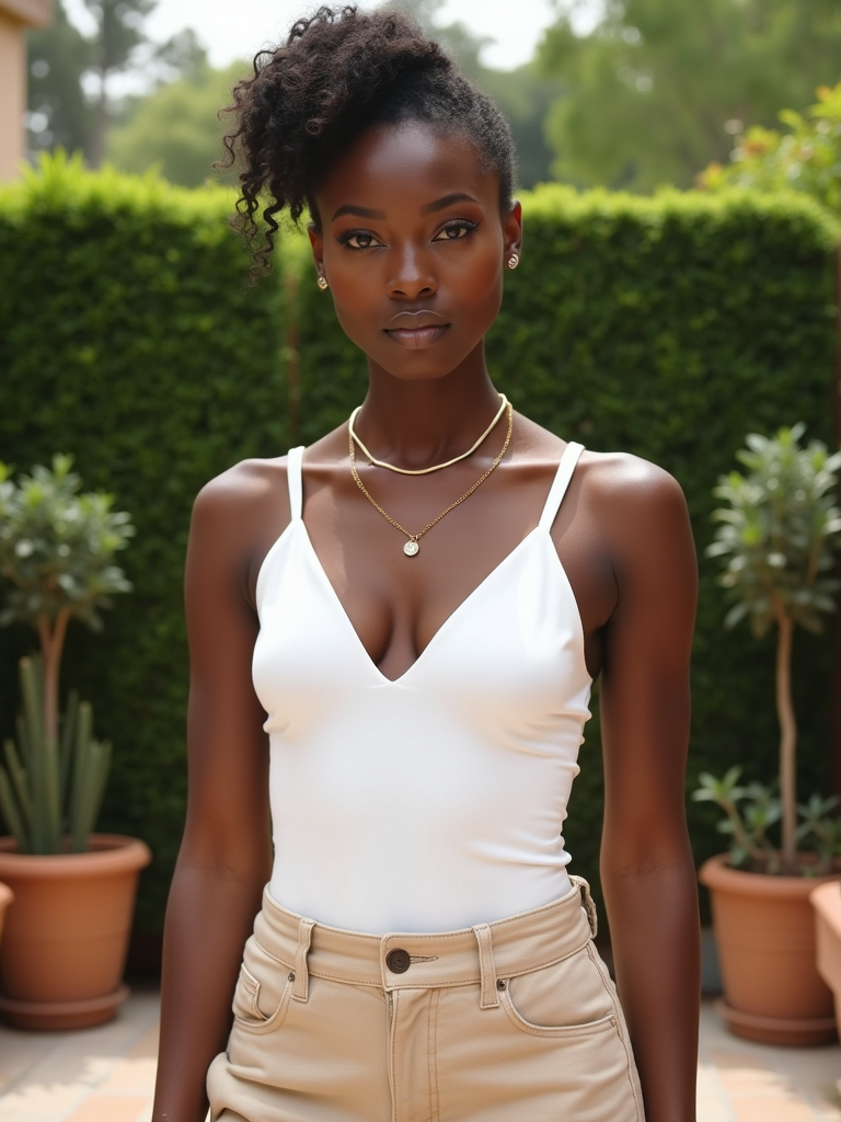 Front view of model wearing a white sleeveless spaghetti top . The model is standing in an outdoor garden setting with lush greenery and potted plants in the background. The model's face is slightly tilted with a direct gaze towards the camera. The outfit is complemented by beige pants, and a necklace is visible around the model's neck. The background shows a mix of trimmed hedges and trees, creating a serene and natural atmosphere.