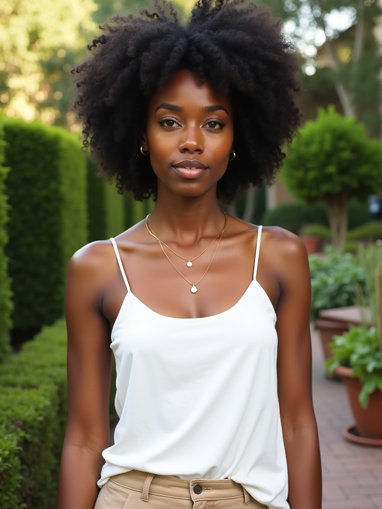 Front view of model wearing a white sleeveless spaghetti top . The model is standing in an outdoor garden setting with lush greenery and potted plants in the background. The model's face is slightly tilted with a direct gaze towards the camera. The outfit is complemented by beige pants, and a necklace is visible around the model's neck. The background shows a mix of trimmed hedges and trees, creating a serene and natural atmosphere.