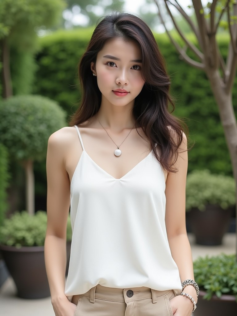 Front view of model wearing a white sleeveless spaghetti top . The model is standing in an outdoor garden setting with lush greenery and potted plants in the background. The model's face is slightly tilted with a direct gaze towards the camera. The outfit is complemented by beige pants, and a necklace is visible around the model's neck. The background shows a mix of trimmed hedges and trees, creating a serene and natural atmosphere.
