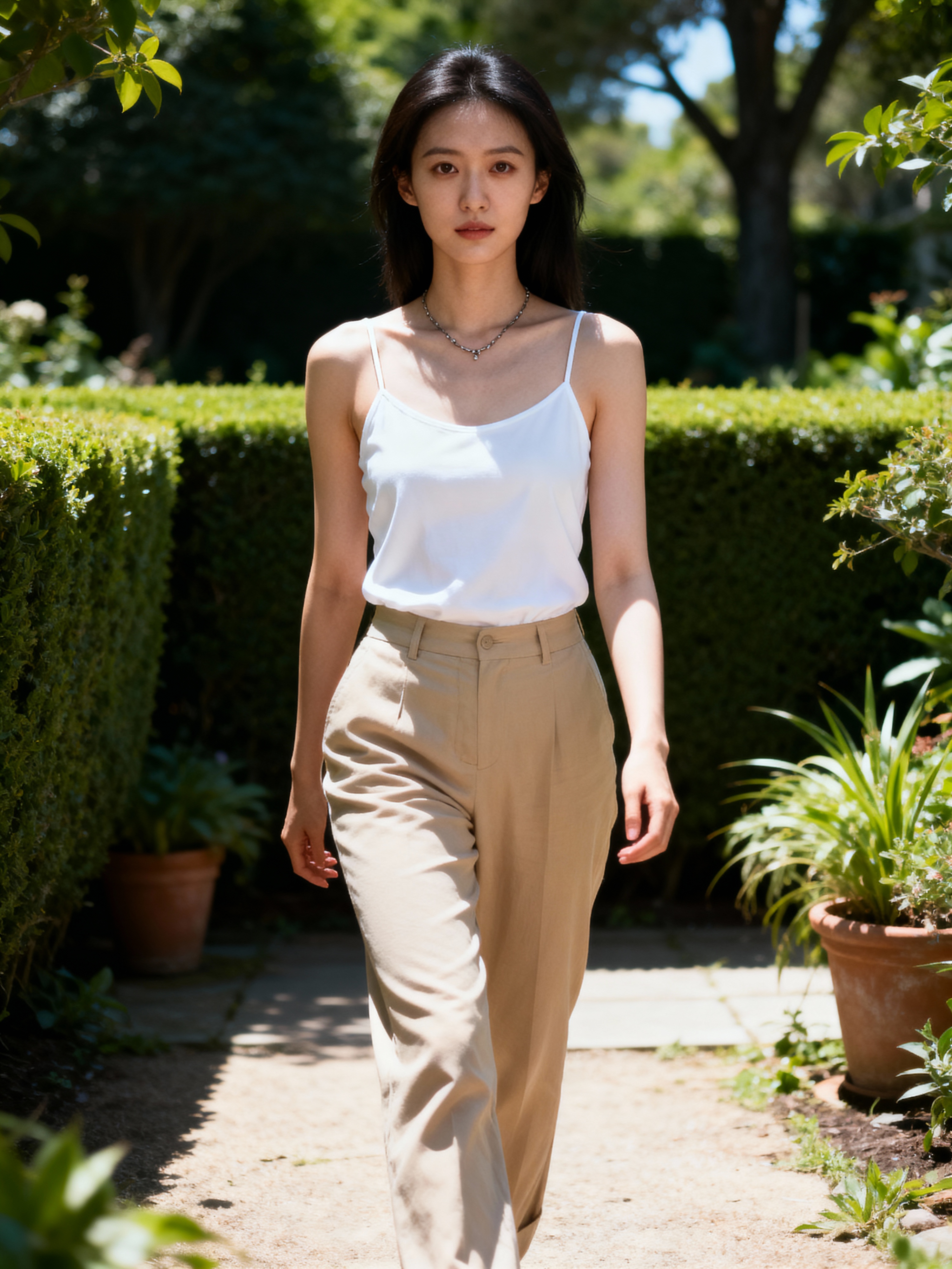 Front view of model wearing a white sleeveless spaghetti top . The model is standing in an outdoor garden setting with lush greenery and potted plants in the background. The model's face is slightly tilted with a direct gaze towards the camera. The outfit is complemented by beige pants, and a necklace is visible around the model's neck. The background shows a mix of trimmed hedges and trees, creating a serene and natural atmosphere.