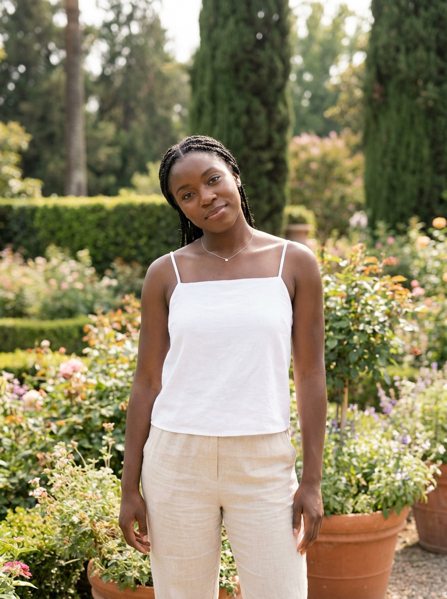 Front view of model wearing a white sleeveless spaghetti top . The model is standing in an outdoor garden setting with lush greenery and potted plants in the background. The model's face is slightly tilted with a direct gaze towards the camera. The outfit is complemented by beige pants, and a necklace is visible around the model's neck. The background shows a mix of trimmed hedges and trees, creating a serene and natural atmosphere.