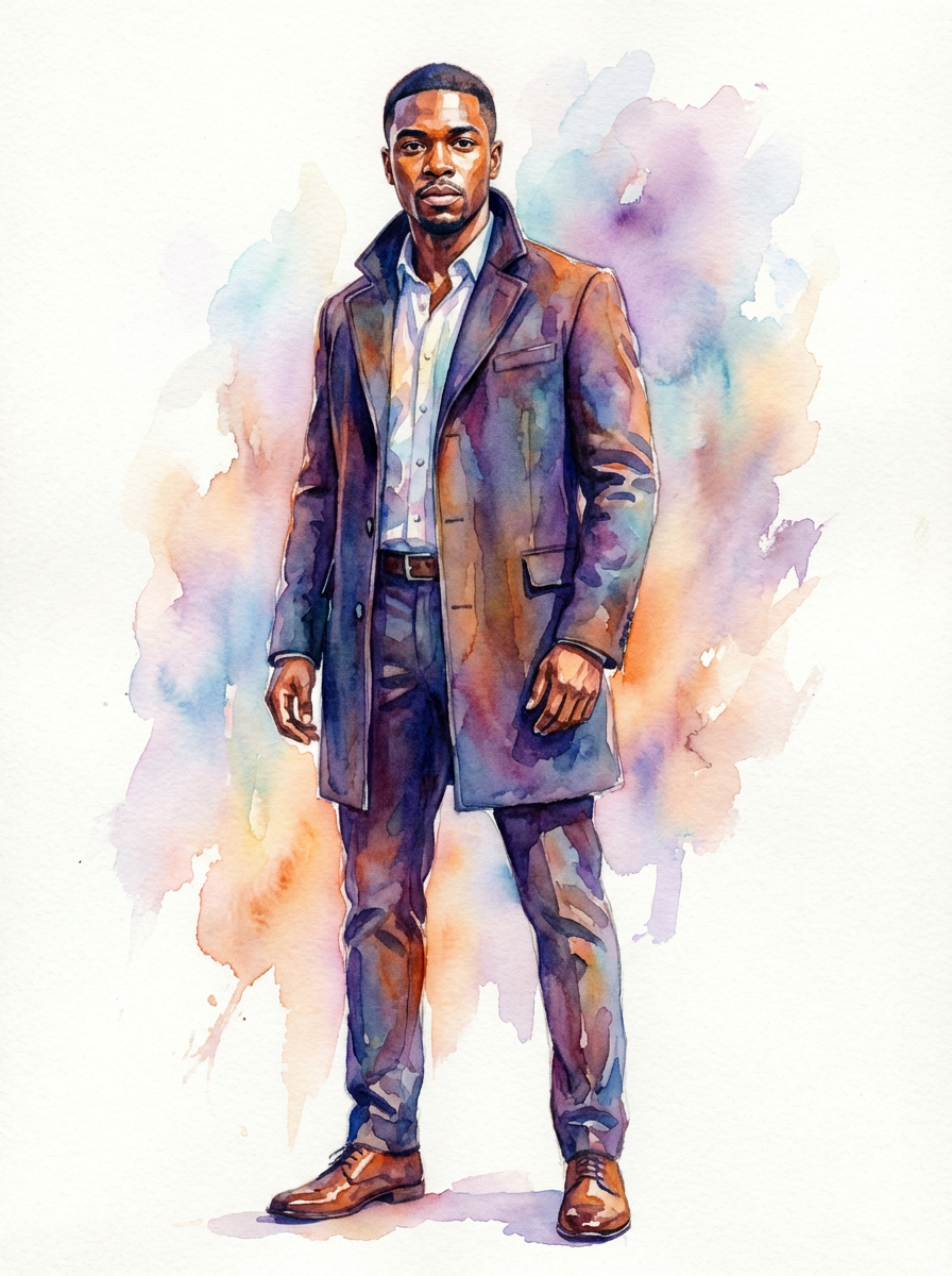 Full body artistic portrait of model as a watercolor painting. Strong stance, vibrant hues. Delicate brushwork, ethereal quality.