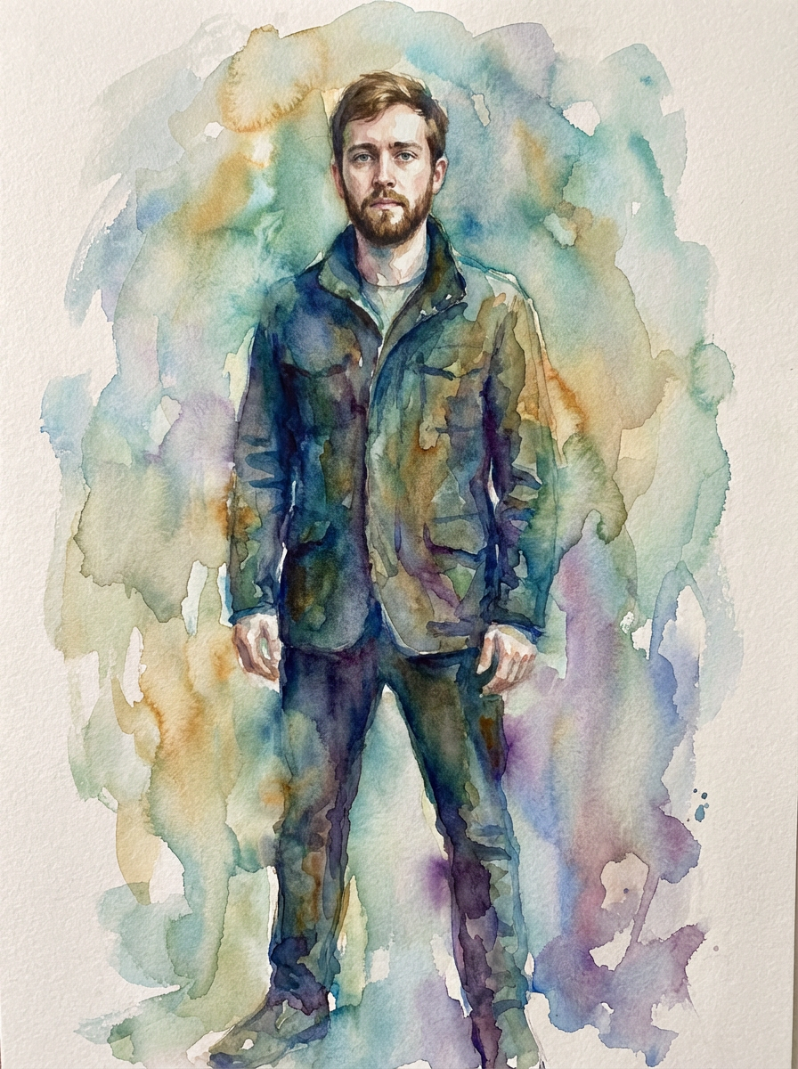 Full body artistic portrait of model as a watercolor painting. Strong stance, vibrant hues. Delicate brushwork, ethereal quality.