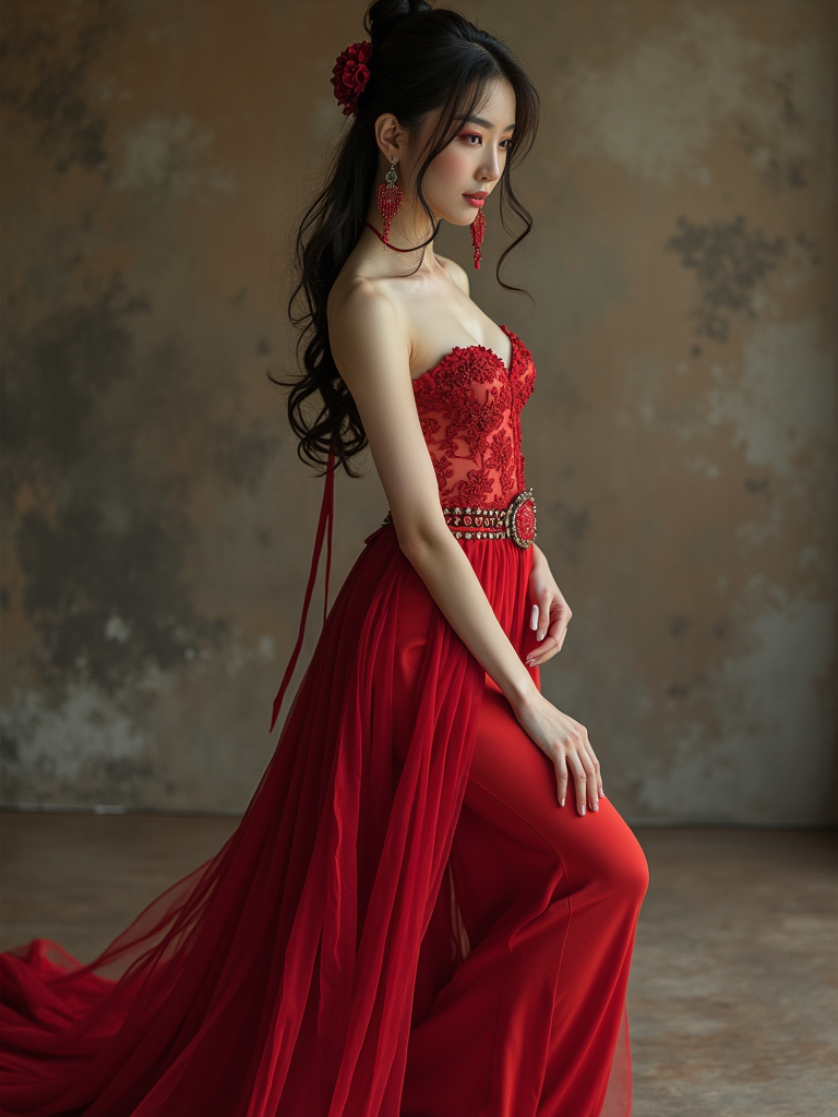 Full body artistic portrait of model. Alluring pose, elegant outfit . Fine art photography style.