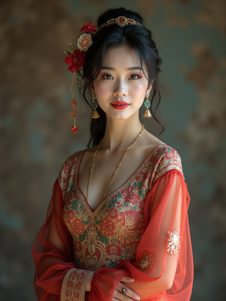 Full body artistic portrait of model. Alluring pose, elegant outfit . Fine art photography style.
