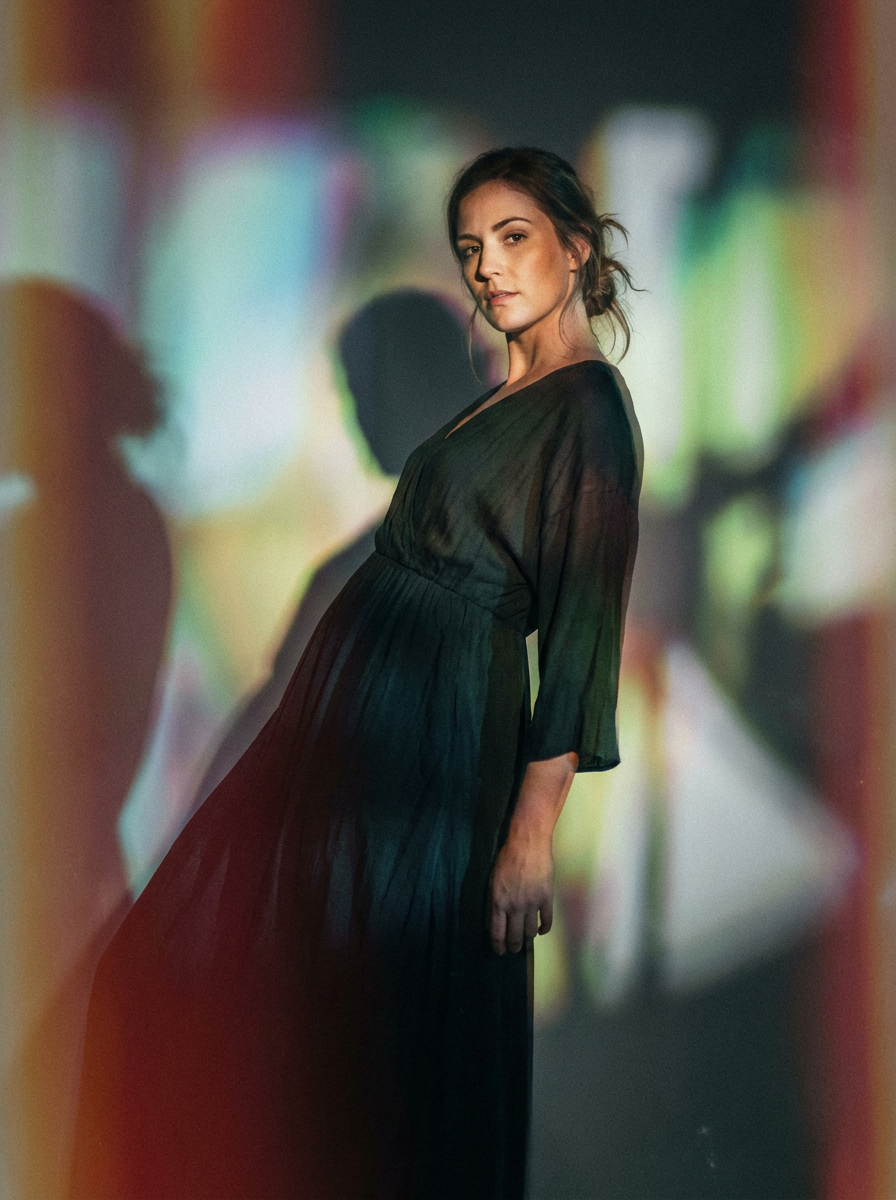 Full body artistic portrait of model. Complete artistic composition, seductive pose . Experimental photography.