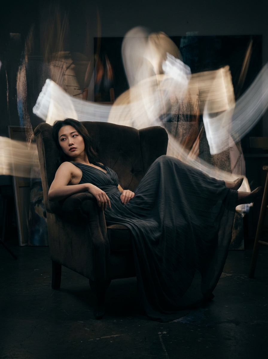 Full body artistic portrait of model. Complete artistic composition, seductive pose . Experimental photography.