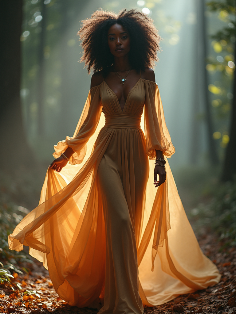 Full body dreamy portrait of model. Complete ethereal look, flowing outfit, alluring pose . Magical atmosphere.