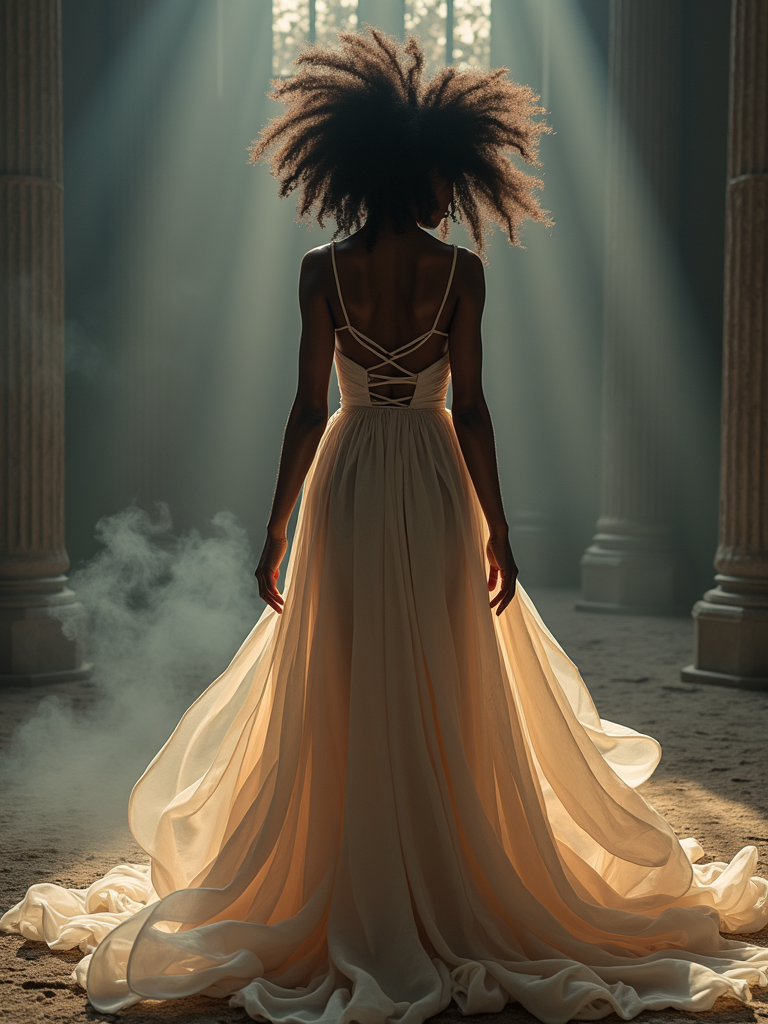 Full body dreamy portrait of model. Complete ethereal look, flowing outfit, alluring pose . Magical atmosphere.