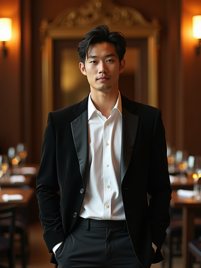 Full-body front view shot of model enjoying a luxury gala dinner, dressed as a formal dinner jacket with a crisp white shirt. High end luxury restaurant.