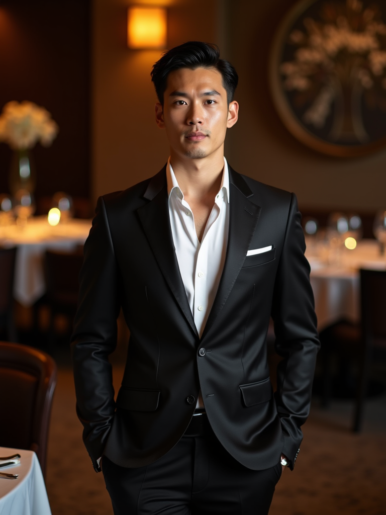 Full-body front view shot of model enjoying a luxury gala dinner, dressed as a formal dinner jacket with a crisp white shirt. High end luxury restaurant.