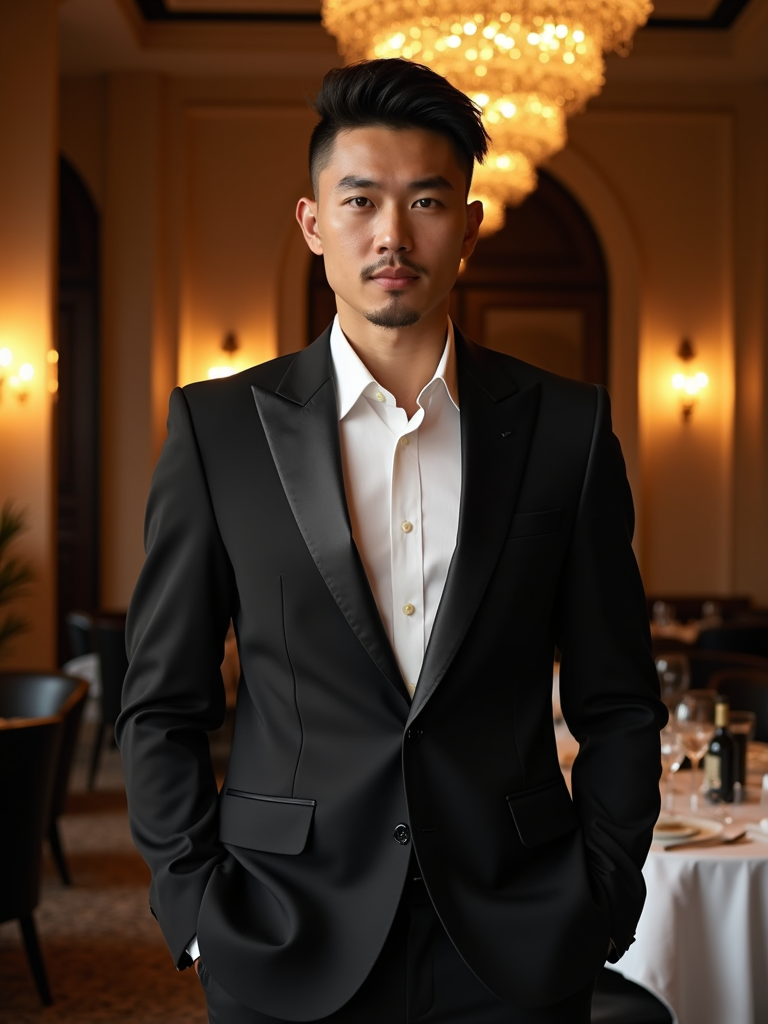 Full-body front view shot of model enjoying a luxury gala dinner, dressed as a formal dinner jacket with a crisp white shirt. High end luxury restaurant.