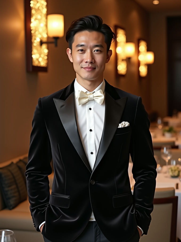 Full-body front view shot of model enjoying a luxury gala dinner, dressed as a formal dinner jacket with a crisp white shirt. High end luxury restaurant.