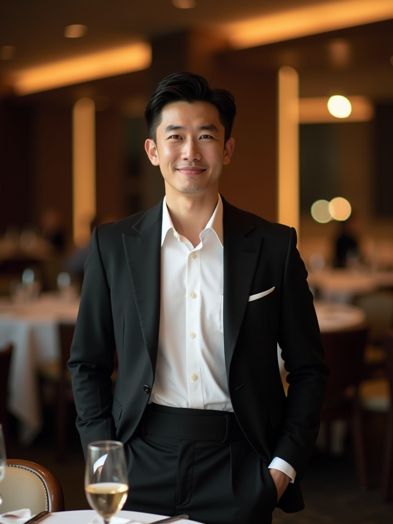 Full-body front view shot of model enjoying a luxury gala dinner, dressed as a formal dinner jacket with a crisp white shirt. High end luxury restaurant.