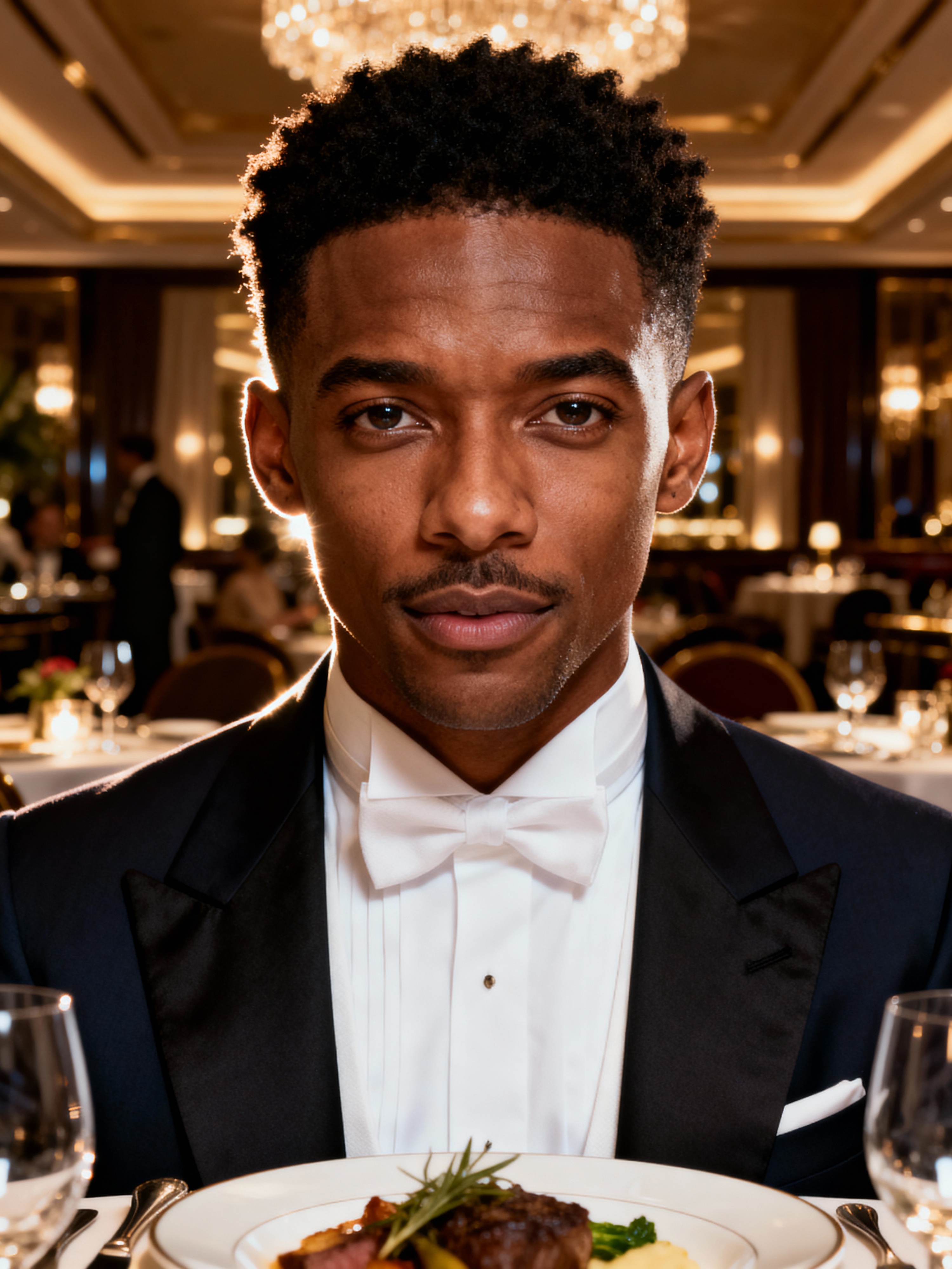 Full-body front view shot of model enjoying a luxury gala dinner, dressed as a formal dinner jacket with a crisp white shirt. High end luxury restaurant.