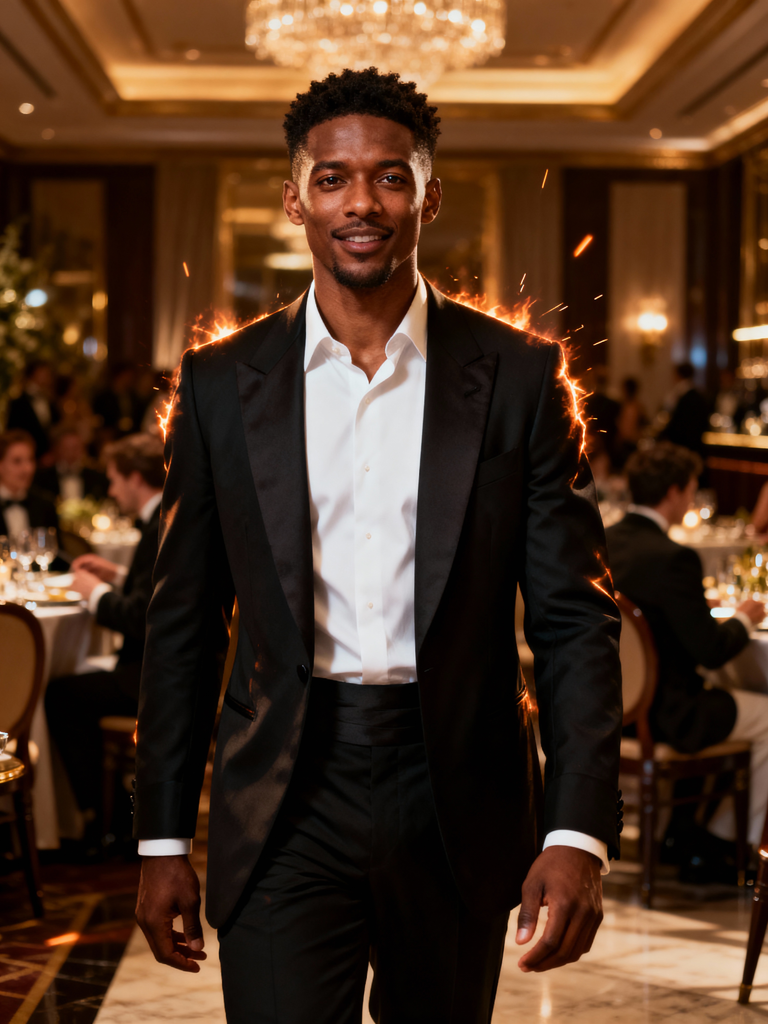 Full-body front view shot of model enjoying a luxury gala dinner, dressed as a formal dinner jacket with a crisp white shirt. High end luxury restaurant.