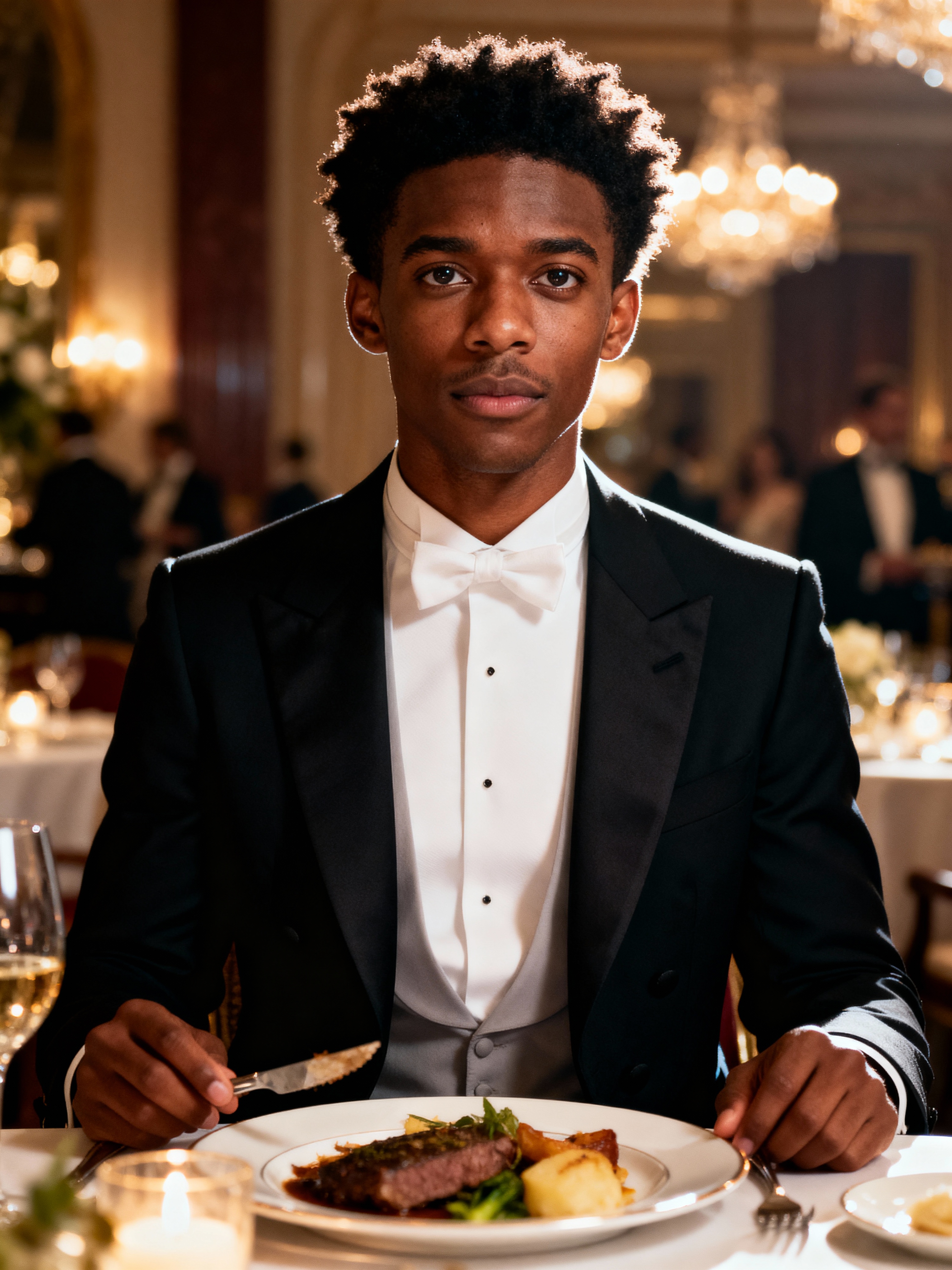 Full-body front view shot of model enjoying a luxury gala dinner, dressed as a formal dinner jacket with a crisp white shirt. High end luxury restaurant.